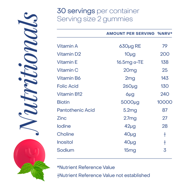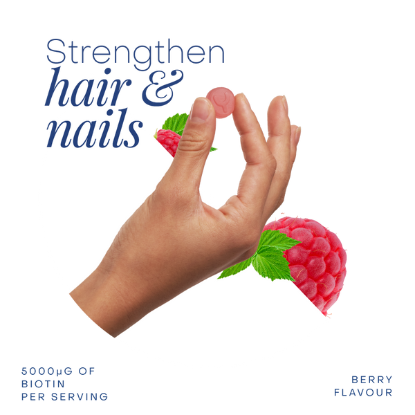 Hair, Skin & Nails (Biotin) gummies come in a tasty berry flavour.