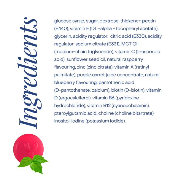 glucose syrup, sugar, dextrose, thickener: pectin (E440), vitamin E (DL -alpha - tocopheryl acetate), glycerin, acidity regulator: citric acid (E330), antioxidant: sodium citrate (E331), MCT Oil (medium-chain triglyceride), vitamin C (L-ascorbic acid), sunflower seed oil, natural raspberry flavouring, zinc (zinc citrate), vitamin A (retinyl palmitate), purple carrot juice concentrate, natural blueberry flavouring, pantothenic acid (D-pantothenate, calcium), biotin (D-biotin), vitamin D (ergocalciferol), vitamin B6 (pyridoxine hydrochloride), vitamin B12 (cyanocobalamin), folic acid (5-methyltetrahydrofolate), choline (choline bitartrate), inositol, iodine (potassium iodide).