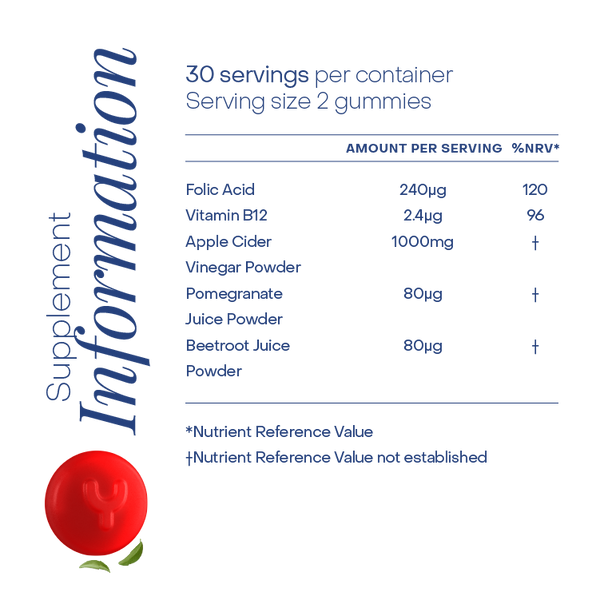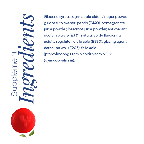 glucose syrup, sugar, apple cider vinegar powder, glucose, thickener: pectin (E440), pomegranate juice powder, beetroot juice powder, antioxidant: sodium citrate (E331), natural apple flavouring, acidity regulator: citric acid (E330), vegetable oil, glazing agent: carnauba wax (E903), β-cartotene, folic acid (pteroylmonoglutamic acid), vitamin B12 (cyanocobalamin).