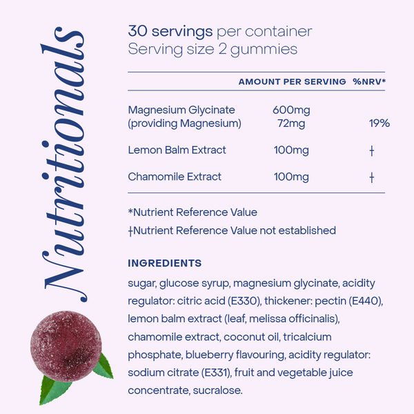 Sugar, Glucose Syrup, Magnesium Glycinate, Acidity Regulator: Citric Acid, Thickener: Pectin, Lemon Balm Extract (Leaf, Melissa Officinalis), Chamomile Extract, Coconut Oil, Tricalcium Phosphate, Blueberry Flavouring, Acidity Regulator: Sodium Citrate, Fruit & Vegetable Juice Concentrate, Sucralose
