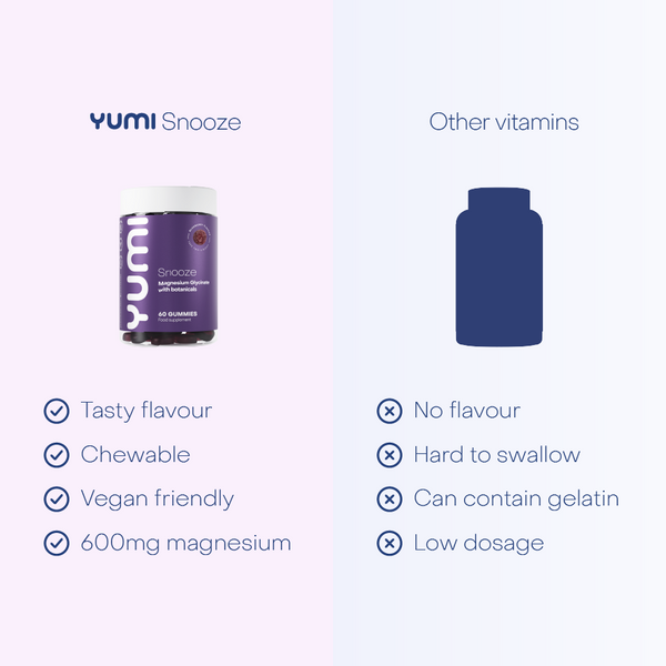 We all know that getting enough sleep plays a key role in protecting our mental & physical health. Our Snooze gummies are designed to give you a helping hand. They are packed with Magnesium Glycinate - a highly absorbable form of magnesium linked with improved sleep - plus chamomile and lemon balm.