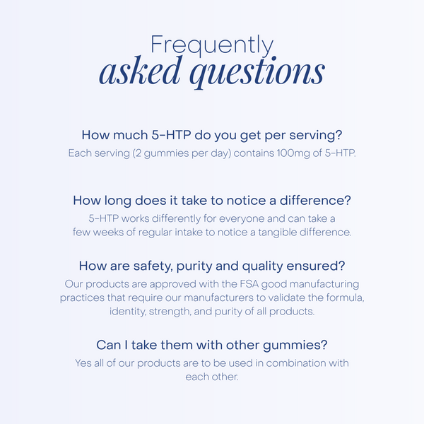 Each serving (2 gummies per day) contains 800mg griffonia seed extract in the naturally occurring 8:1 ratio. This is equivalent to 100mg of 5-HTP.